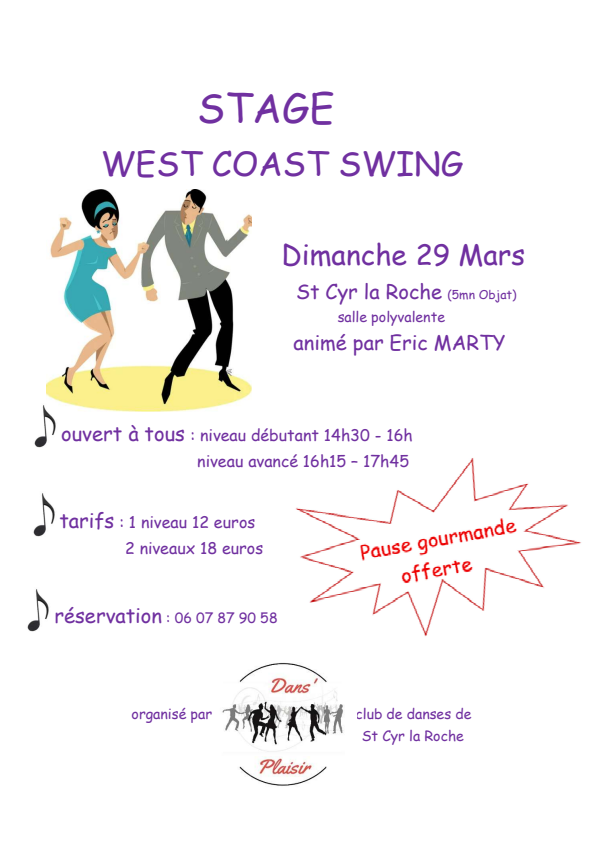 Dans'Plaisir vous invite dimanche 29 mars à son stage de West Coast , animé par Eric Marty, salle polyvalente de Saint Cyr la Roche. Voir affiche ci Jointe