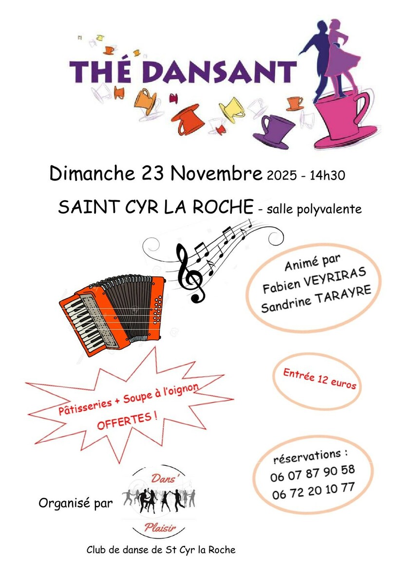 Dans'Plaisir vous invite à son aprés midi dansante dimanche 23 novembre à partir de 14h30 salle polyvalente de Saint Cyr la Roche, animé par Sandrine Tarayre et Fabien Veyriras .